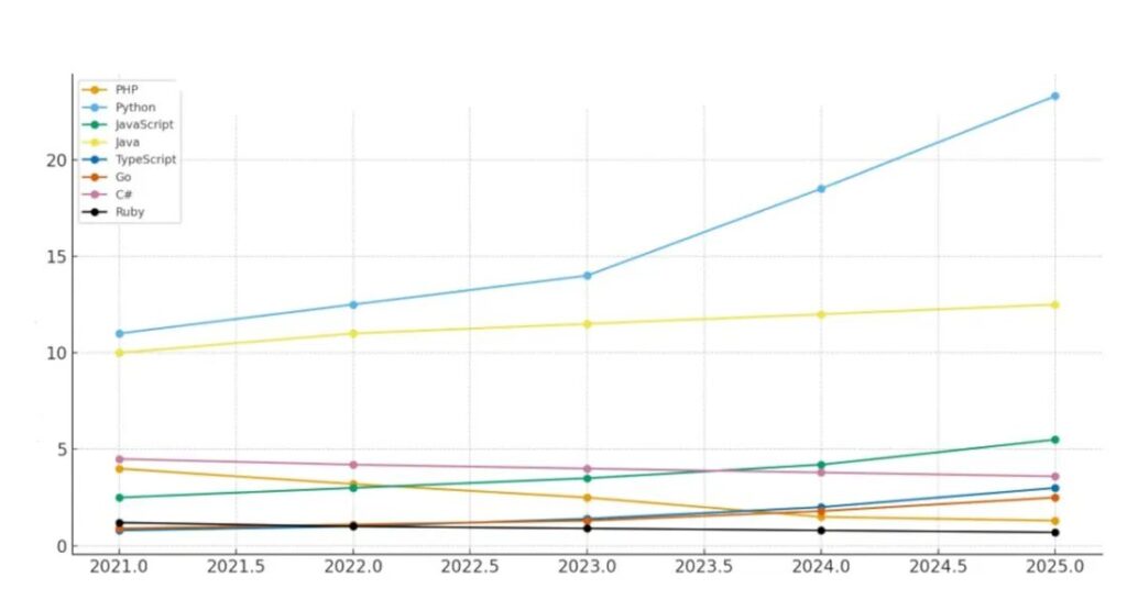 Gráfico comparativo de PHP frente a otros lenguajes de programación de 2021 a 2025 con valores aproximados basados en Tiobe, PYPL y Google Trends. En el eje X del gráfico, se trata de años (2021-2025).