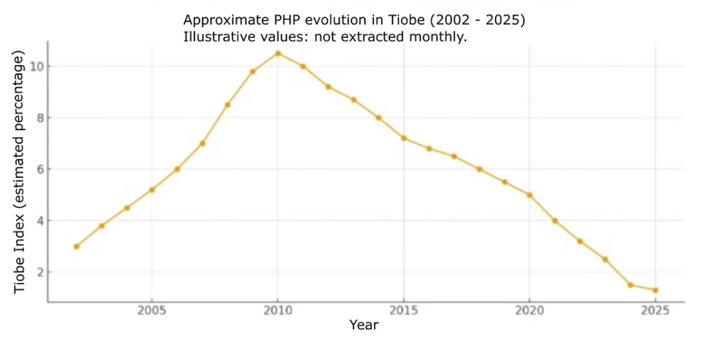 Gráfico basado en datos del Índice Tiobe (https://www.tiobe.com/tiobe-index/). Muestra la evolución de PHP, desde 2002 a 2025