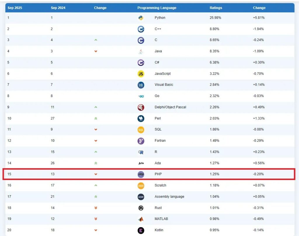 ¿Qué? ¡PHP está incluso por debajo de ObjectPascal/Delphi, Perl, Visual Basic y… Fortran! 💥💢 En cuanto a los primeros, no hay sorpresas: Python, C++/C y Java 🤷. Un momento, investiguemos un poco más: